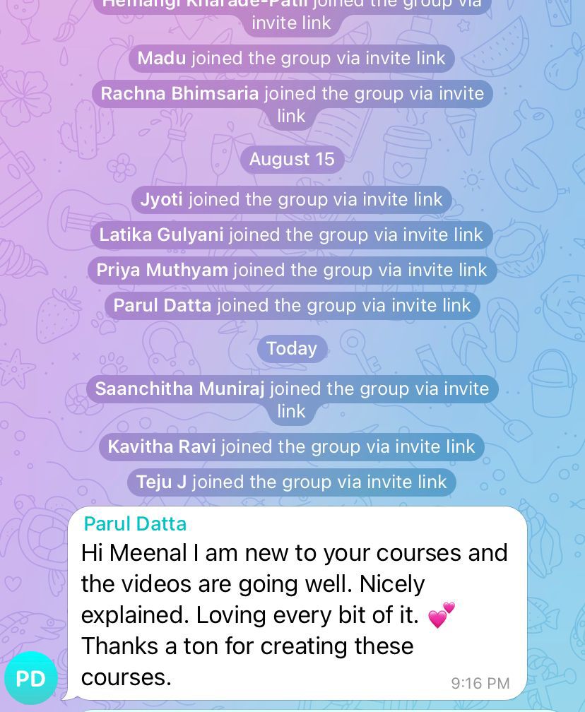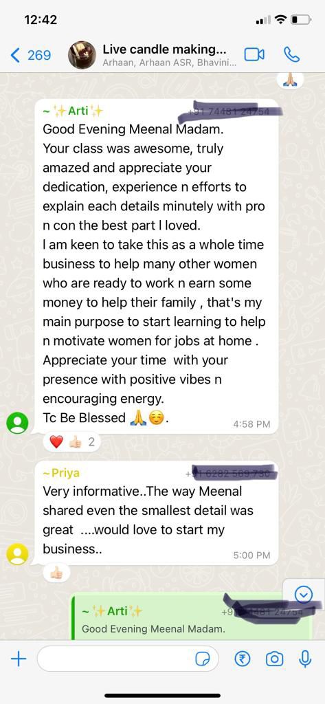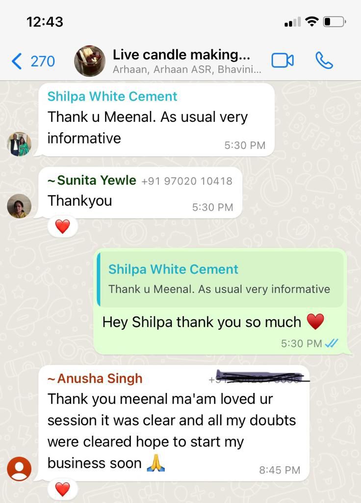 Whatsapp & Google Meet. Once you enroll, you will get access to the whatsapp group – where you ask your questions/doubts and we will reply. We also have live session where you can ask doubts to Swapnali. Need help? Just reach out on whatsapp or join the weekly google meet. We believe in providing comprehensive support through every stage of your journey, from understanding raw materials to launching your business.