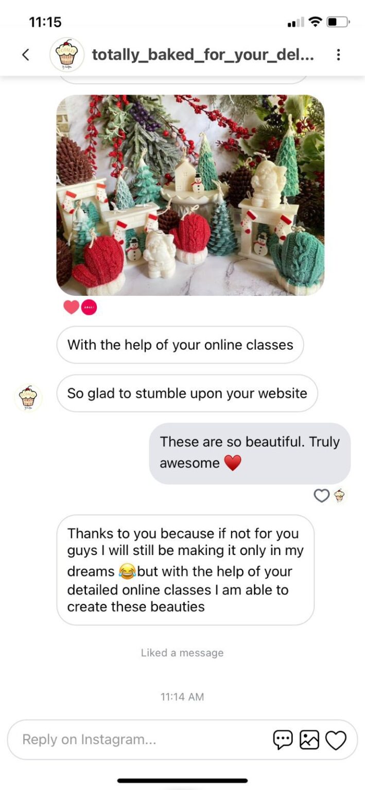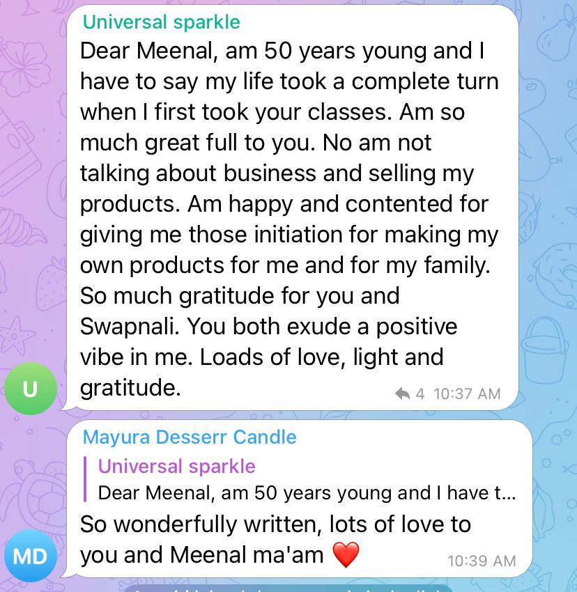 There’s nothing more fulfilling than watching my students discover the magic of candle making, seeing their eyes light up as they unmold their first perfect candle, or receiving messages about their successful ventures.